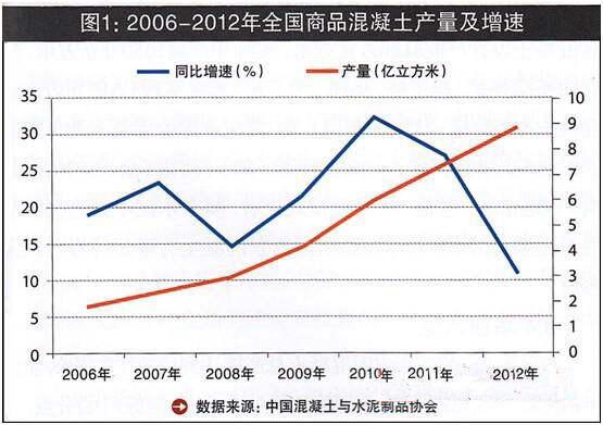 2012年前三季度,房地產(chǎn)調(diào)控和重點(diǎn)在建續(xù)建大型工程項(xiàng)目啟動(dòng)緩慢,商品混凝土市場(chǎng)需求大幅下降,前三季度累計(jì)同比增長(zhǎng)7.9%,到了第四季度增幅有所回升,最終全年增速在11%。