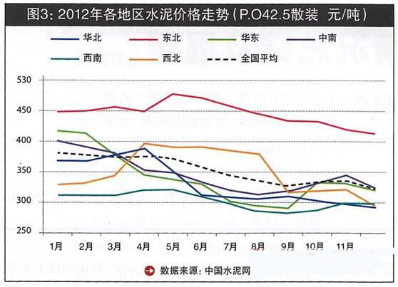 商品混凝土價(jià)格主要取決于成本方的水泥價(jià)格及需求情況,2012年全國(guó)水泥價(jià)格呈現(xiàn)前高后低的"U"型走勢(shì),東北地區(qū)價(jià)格保持在全國(guó)最高位運(yùn)行,西南成為全國(guó)水泥價(jià)格凹地。